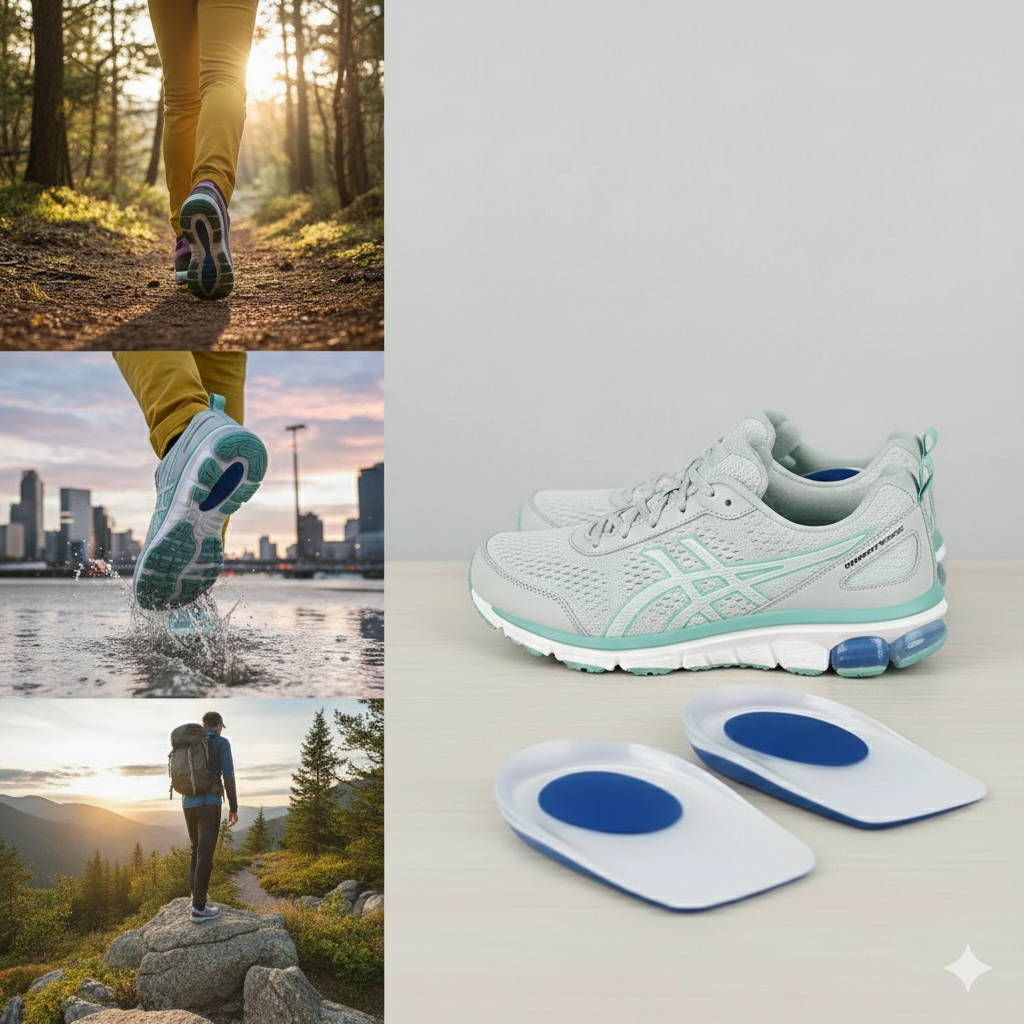 2) Leidet man bereits unter einem unteren Fersensporn (unterhalb der Fußsohle) können spezielle Einlagen mit einer Aussparung bzw. angepassten Gelmischung helfen. Bspw.: viskoelastische, mit einer Art Gel gefüllte Einlagen oder breite Pufferabsätze. Diese verteilen den entstehenden Druck auf die gesamte Ferse und federn Stöße besser ab.